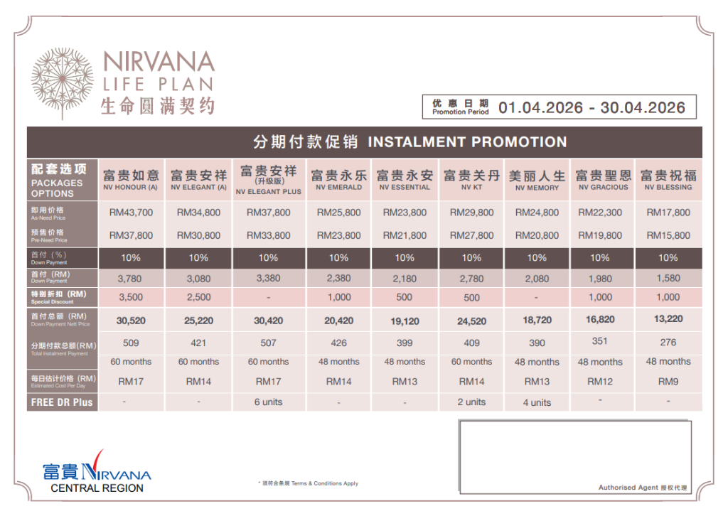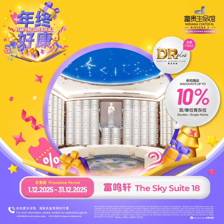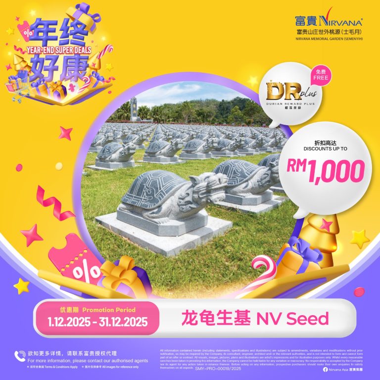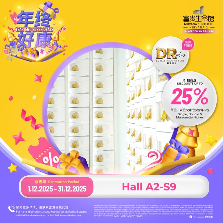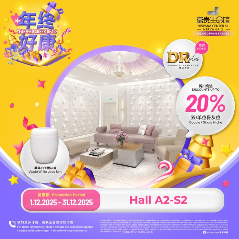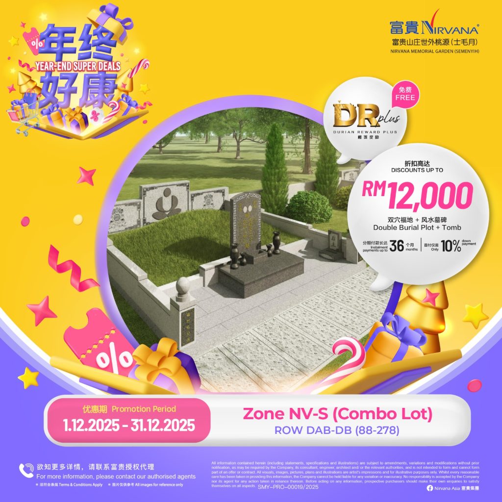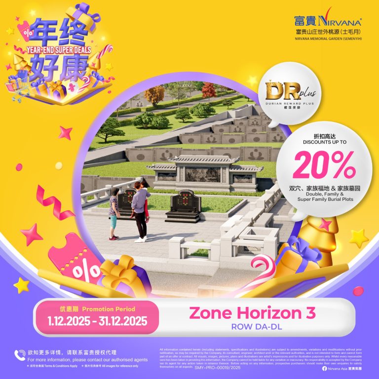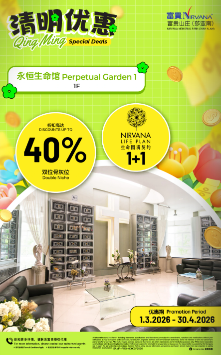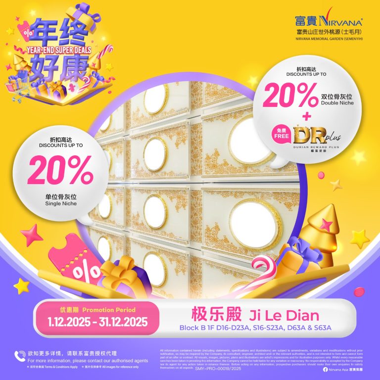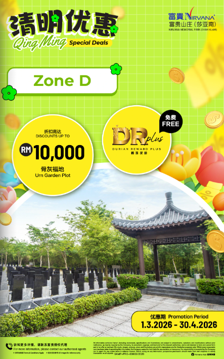 可获得 2 unit DR plus,的榴莲园奖励金 Exclusive Special Discount up to 20% Discount 头期只需付20% Down Payment 免利息分期付款高达24/36个月 months interest free installment 风水绝佳,福泽子孙!Good Feng Shui -Price shown above for Pre-Need Niche only*- -One-time Maintenance & Facility Fees*