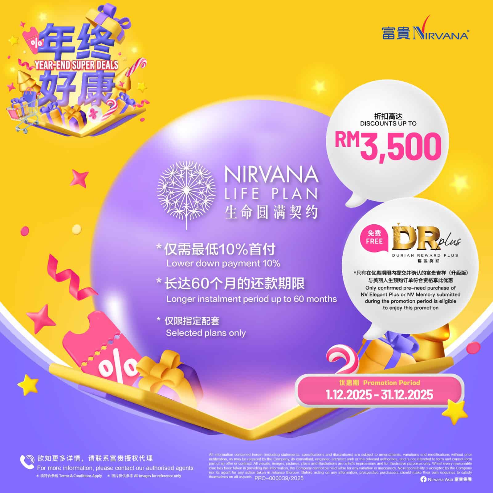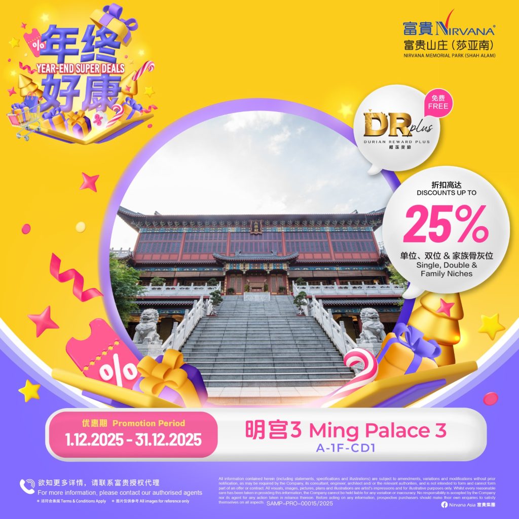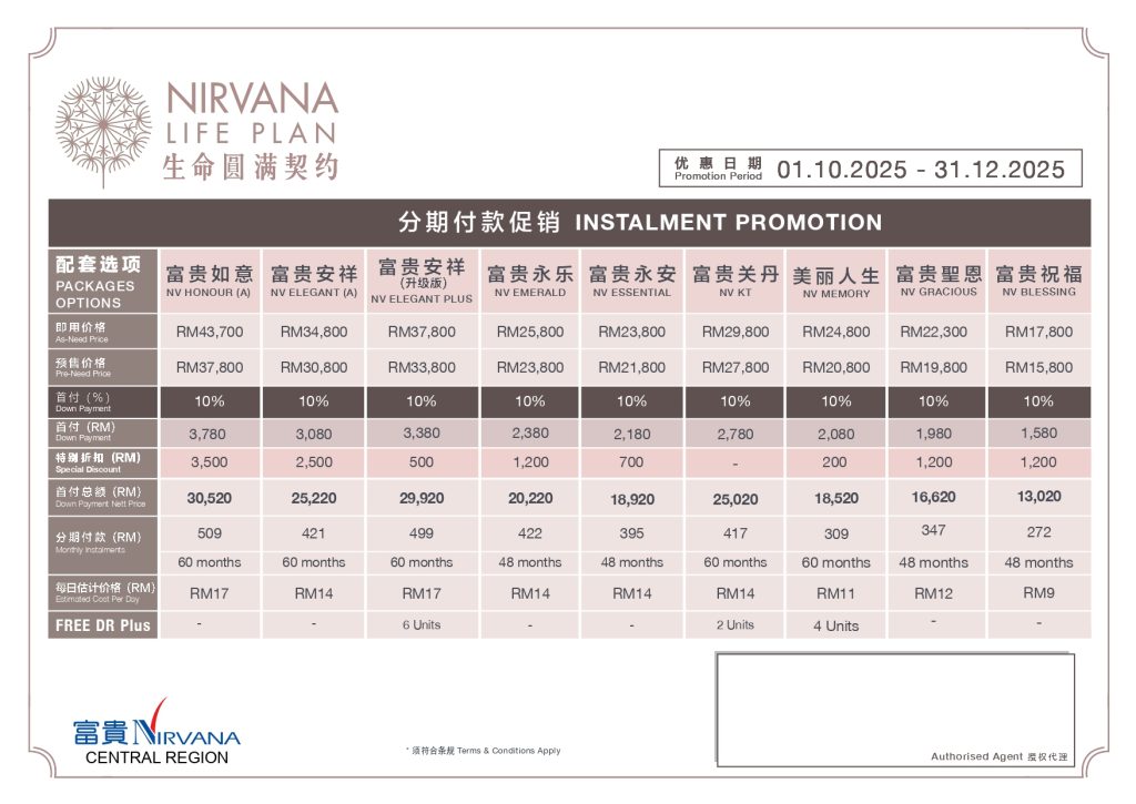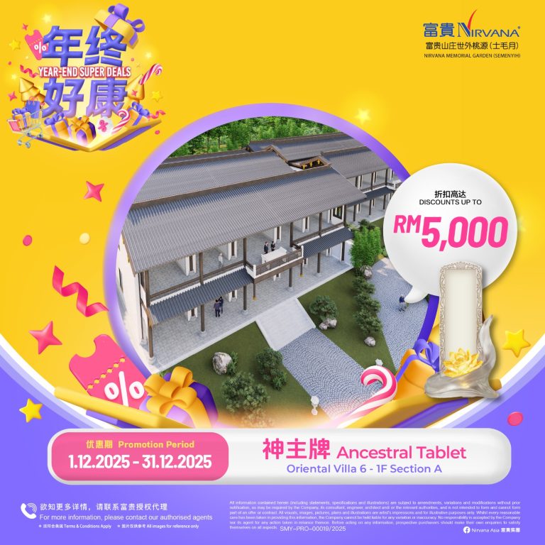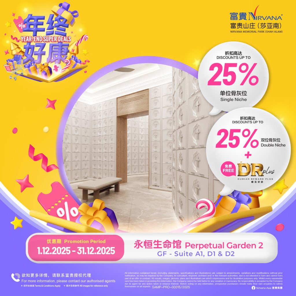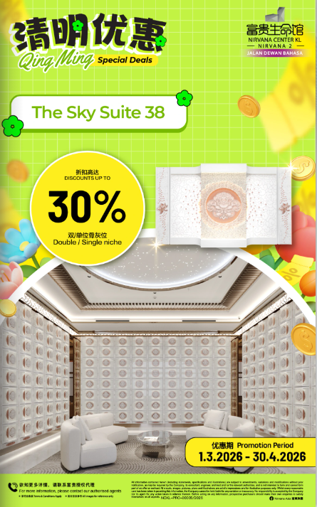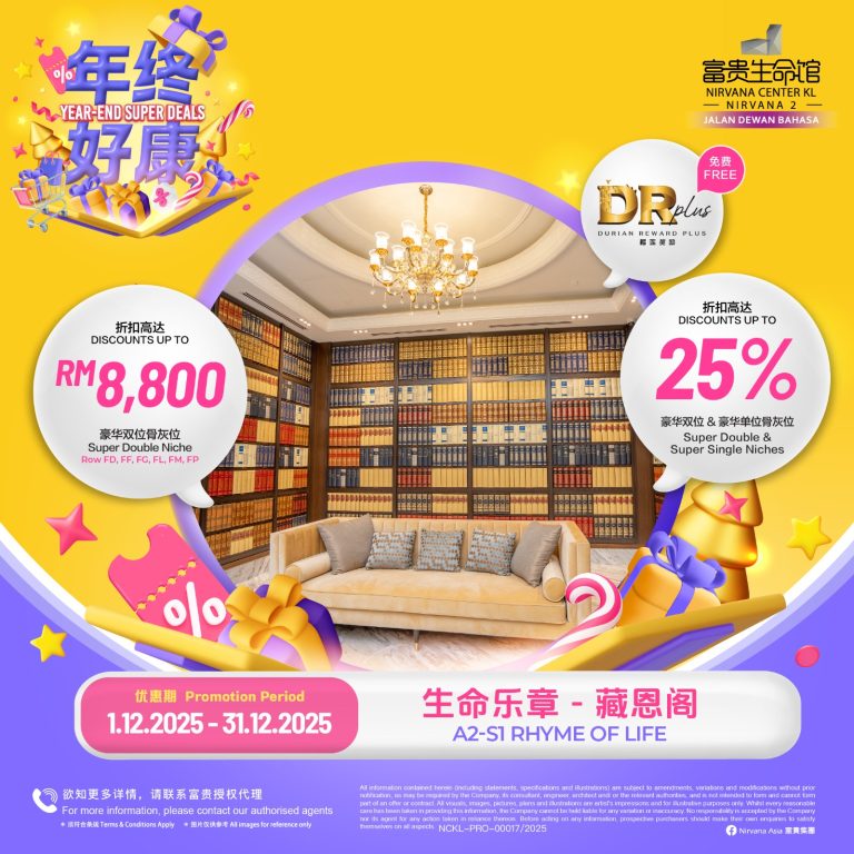 可获得 2 unit DR plus,的榴莲园奖励金 Exclusive Special Discount up to 20% Discount 头期只需付20% Down Payment 免利息分期付款高达24/36个月 months interest free installment 风水绝佳,福泽子孙!Good Feng Shui -Price shown above for Pre-Need Niche only*- -One-time Maintenance & Facility Fees*